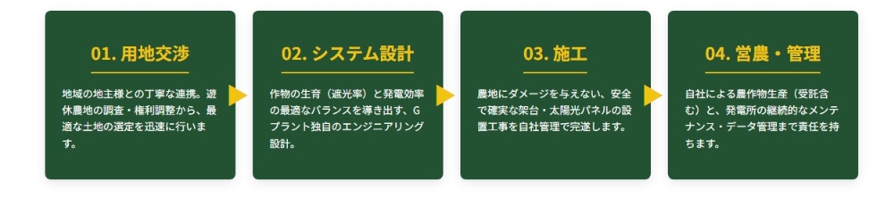 私たちは、営農型発電(ソーラーシェアリング)の全工程を自社グループ内で一括管理します。 中間コストを抑え、スピーディかつ高品質なプロジェクトを実現します。